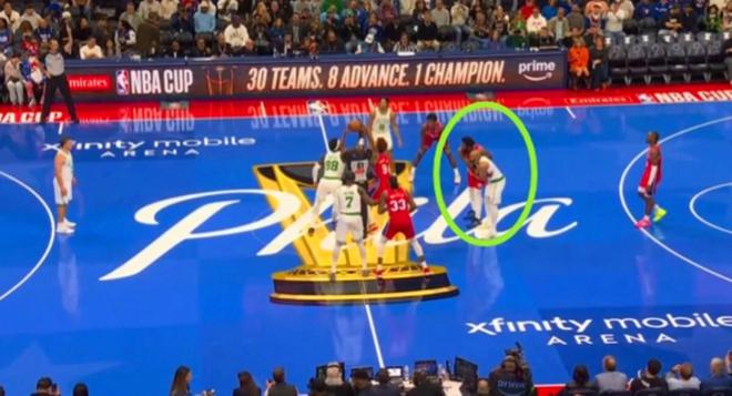 甚至開局跳球恩比德作為一名中鋒都無法完成,而是讓2米01的烏布雷與綠軍2米13的奎塔跳球,恩比德則在一旁低頭與懷特聊天。