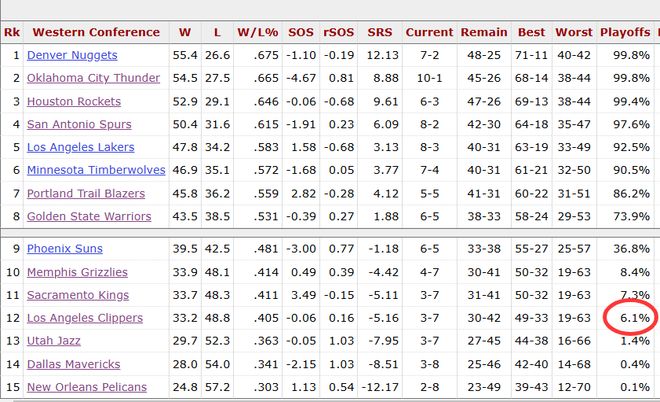 數(shù)據(jù)網(wǎng)站Basketball Reference的季后賽晉級(jí)概率顯示,如今的快船只有6.1%的概率能打進(jìn)季后賽,排名西部倒數(shù)第四,僅高于爵士(1.4%)、獨(dú)行俠(0.4%)和鵜鶘(0.1%)。