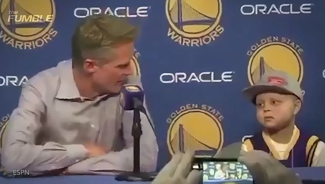 一位小男孩穿著庫里晚安的藍色T恤,起初庫里并沒有在意。