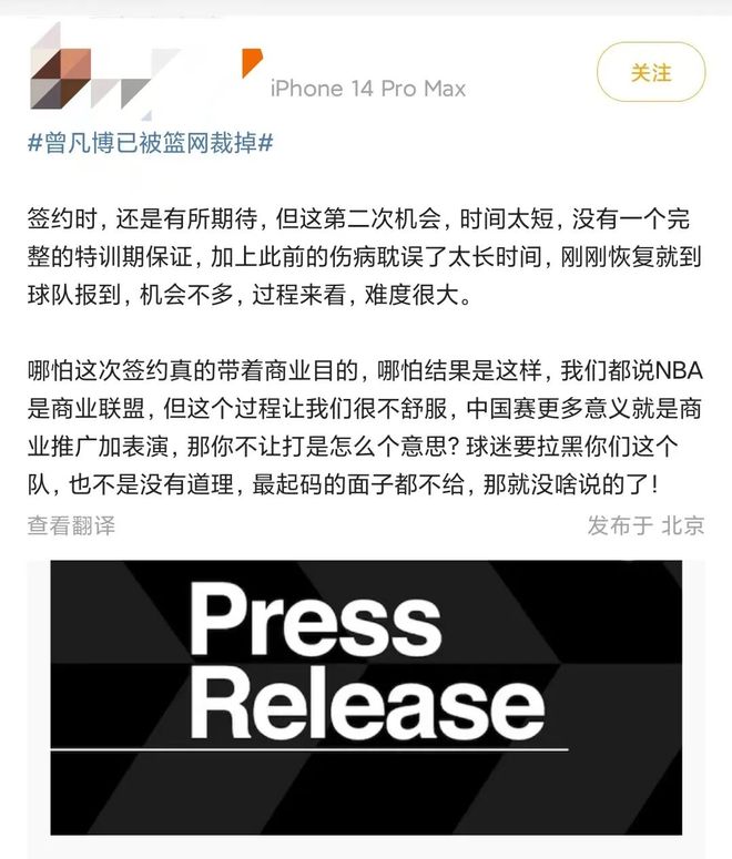 “中國球員曾凡博正式被球隊(duì)裁掉?!?/strong>