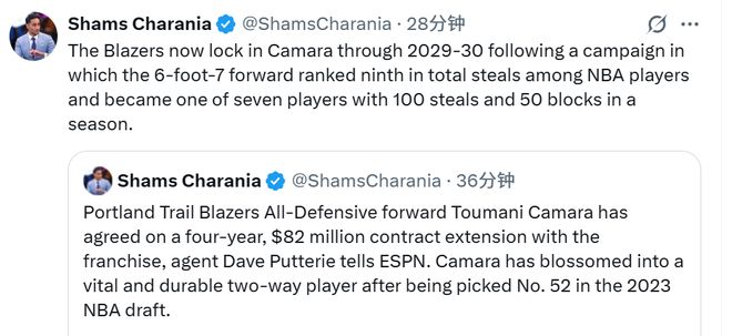 此次續(xù)約后,開拓者隊將卡馬拉的合同鎖定至2029-30賽季。上賽季,這位身高6英尺7英寸(約2.01米)的前鋒展現(xiàn)出極強的防守影響力:全聯(lián)盟搶斷總數(shù)排名第九;成為全聯(lián)盟僅有的7名單賽季完成“100次搶斷+50次蓋帽”的球員之一。