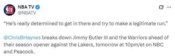 北京時間10月21日,NBA新賽季揭幕戰(zhàn)一觸即發(fā),庫里和巴特勒已經(jīng)帶隊飛往洛杉磯,名記Chris Haynes報道,巴特勒對新賽季下了很大的決心,他要全力以赴帶隊爭奪總冠軍。