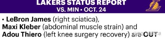 而湖人戰(zhàn)森林狼前,總算迎來了利好,那就是兩名大將東契奇和里夫斯傷勢無礙,對陣森林狼都可以打。然而在傷病名單里,湖人還有詹姆斯、克勒貝爾和新秀阿杜-蒂耶羅,只能說現(xiàn)階段未增加更多傷員,已經(jīng)算是一件幸事。