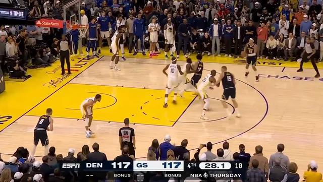 掘金上半場投出了18中10的三分,但下半場三分命中率驟減,第三節(jié)只有13中2。勇士也只是用了一節(jié)比賽就把比賽扳回來了,庫里第三節(jié)手感回暖,雙方再次展開對攻。