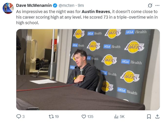 但賽后接受湖人媒體采訪時(shí)里夫斯說道:嗯,這個(gè)夜晚的確非常精彩,但這跟我其他級(jí)別比賽創(chuàng)造的高分簡(jiǎn)直不值一提,我曾在高中的一場(chǎng)三加時(shí)的比賽中拿到過73分。(里夫斯這個(gè)回應(yīng)時(shí)有些偷笑,有種笑侃不值一提的既視感)