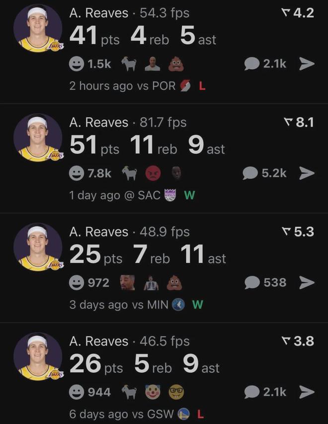 里夫斯背靠背兩場(chǎng)得92分,2007年科比以來(lái)湖人隊(duì)首人