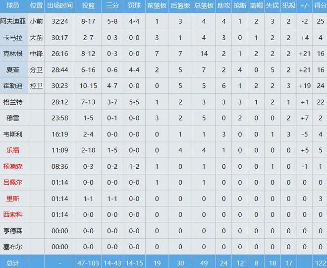 開(kāi)拓者三人得分20+,阿夫迪亞25分4板4助,霍勒迪24分5板6助,格蘭特22分3板3助3斷,克林根16分14板(7前場(chǎng)板)兩雙到手